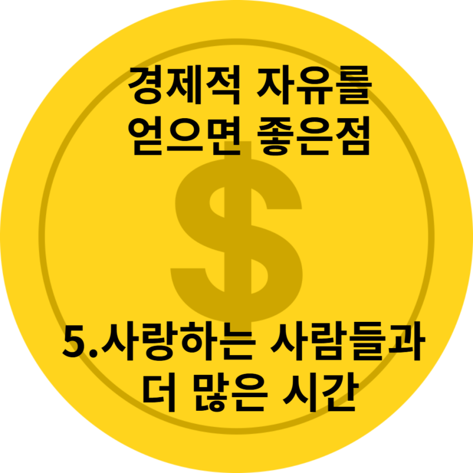 경제적 여유는 사랑하는 사람과 더 많은 시간을 보낼 기회를 제공합니다. 부모님께 효도하거나 자녀에게 더 좋은 교육을 제공하는 것은 물론, 친구들과의 소중한 순간을 즐기기에도 더 많은 자유를 누릴 수 있습니다. 아울러 자신의 자산과 시간을 활용해 사회적인 문제를 해결하는 데 기여하는 것도 가능합니다.